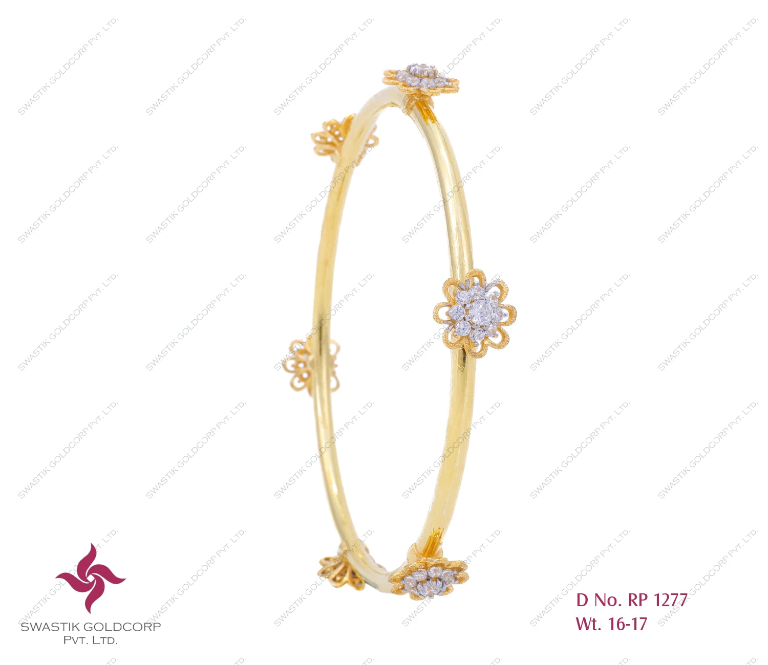 From the Round Pipe Collection by Swastik, this elegant design features delicate floral motifs placed along a sleek cylindrical frame. Its balanced structure and refined finish make it a timeless piece that complements both ethnic and modern attire. Available in pure gold or gold–copper combinations, with customization options to suit your preferred weight and finish.